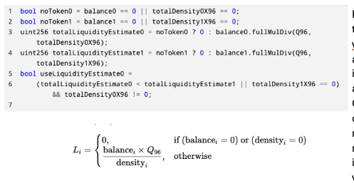 However, with token 0 at such low wei, this assumption worked in favor of the attacker. Conducting a series of tiny withdrawals meant that the resulting difference in actual balance vs. recorded balance was proportionally large. To see how this affected the pool’s liquidity calculation, let’s once again look at the code (and a math translation) to see how exactly Bunni calculates liquidity: