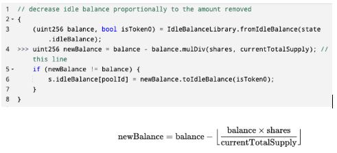 This is the core of the attack. At this stage, the attacker made many tiny liquidity withdrawals of token 0 that caused rounding discrepancies to convince the pool that its liquidity was much lower than it actually was. To understand how this happened, let’s look at the problematic function itself. When LP shares are removed from a pool, the pool’s smart contract decreases both active and idle balances in an amount proportional to what was removed. The below Solidity function shows how Bunni calculates a new idle balance after LP shares are burnt. Note that mulDiv (Solidity) and the square brackets (math) are functions that round down.